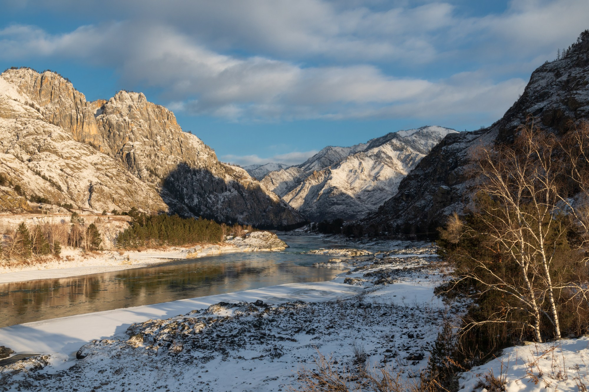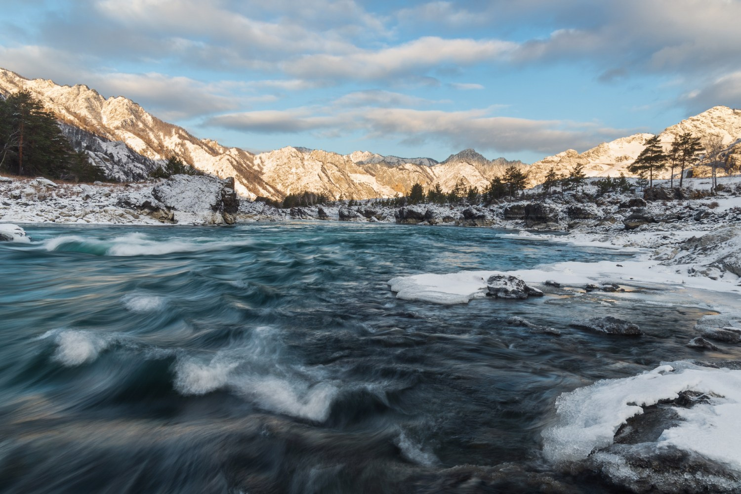 Зимний Алтай очень разный, это время удивительных погодных контрастов и интересных возможностей. Одни горные районы почти все время практически бесснежны, в других снега столько, что всю зиму приходится грести его лопатой в высоченные сугробы. Где-то может стоять околонулевая температура, а в более глубинных областях столбик на термометре опустится до -50 и ниже. Начало зимы (а в горах она приходит ещё в ноябре) знаменуется шугаходом и парящими еще не схваченными льдом речками и, если повезёт со снегом, зрелище открывается поистине восхитительное. Потом шуга слипается в заторы, намерзает придонный лёд припай и к январю большинство потоков сковывает лёд, давая возможность перебраться на другую сторону там, где отродясь не было мостов, и посмотреть на знакомые места с новых точек; гремящие же водопады превращаются в сверкающие бирюзово-сине-зелено-желтые ледопады, на которых частенько можно наблюдать за тренировками ледолазов. Февраль же то кроет морозами, то оттепелями, вода идёт верхом, ледяные панцири начинают вскрываться и начинается ледоход.